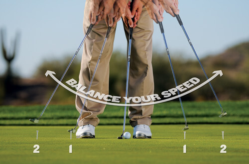 Movement is all about your shoulders, and we do mean ALL about them. In a perfect putt, your feet stay planted and your head stays aimed at the ball while your shoulders swing the putter.